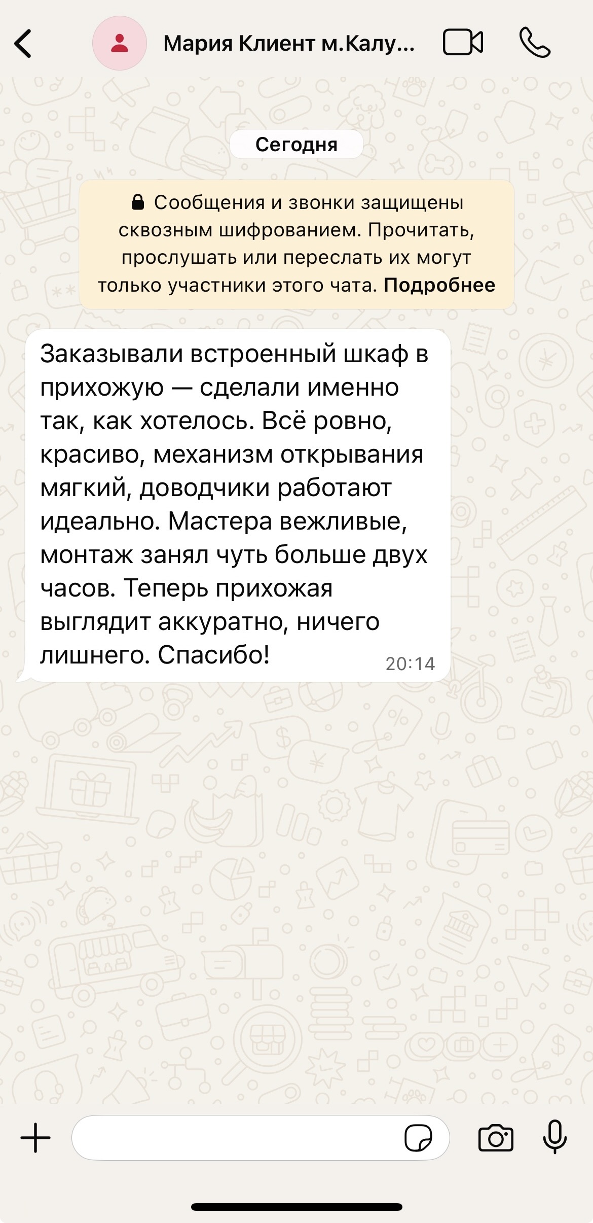 Персональный проект. Вы выбираете материал фасадов, цвет, тип дверей и внутреннее наполнение. Шкаф создаётся под вашу нишу, высоту потолков и стиль помещения, обеспечивая гармоничный внешний вид.